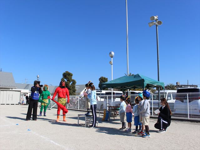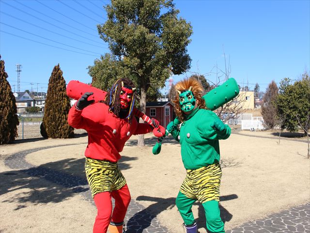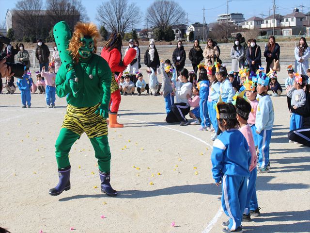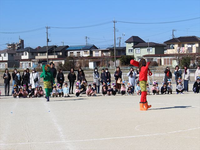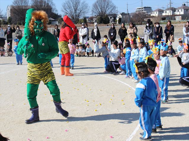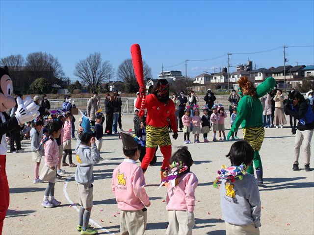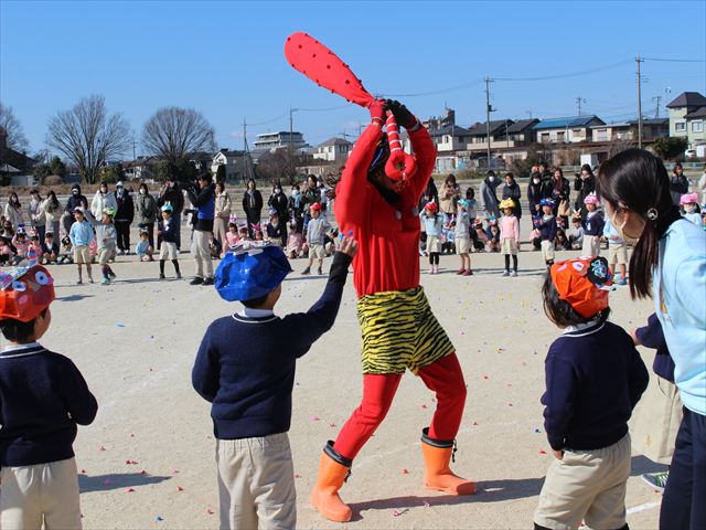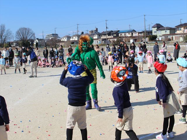各学年それぞれの鬼の被り物を付け、一生懸命に紙で作った豆を投げていじわる鬼、泣き虫鬼を改心させました。