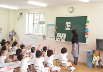 年長組の園児に小学校入学に備えて一年間専門のスタッフがひらがなの読み書きの指導を行っております。ゲームやクイズを通して読む事はもちろんきれいな文字がかけるように指導致します。4月の頃にはほとんど文字がかけないような子も卒園の頃には全員が簡単な作文も書けるようになり、小学校の硬筆展等で入賞する卒園児も多くおります。